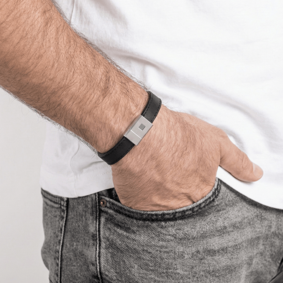 - הצמיד עשוי מעור איטלקי חלק בצבע שחור בעובי של 12 מ״מ ואורך של 250 מ״מ.